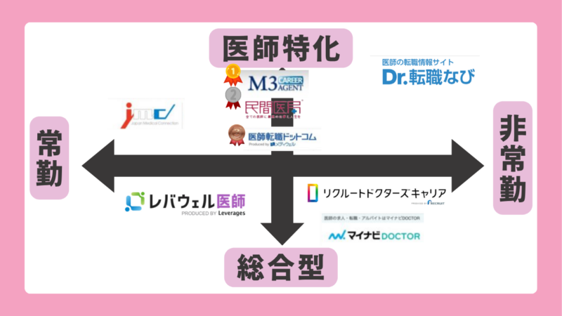 | エムスリーキャリアエージェント | 民間医局 | 医師転職ドットコム | Dr.転職なび | JMC | |