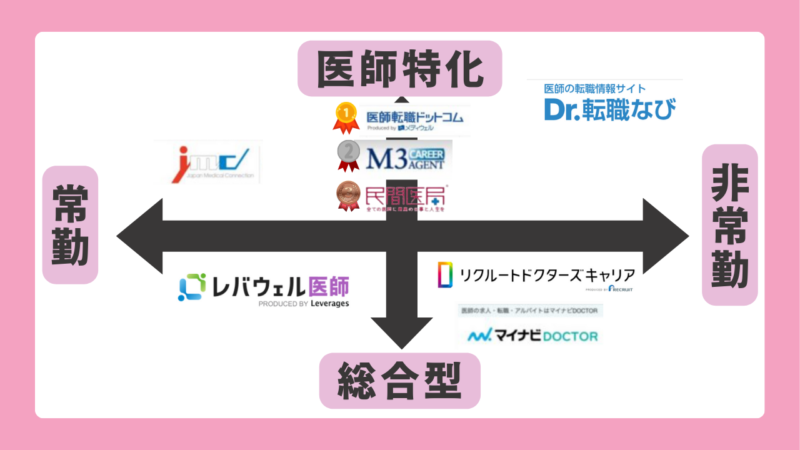 | 【1位】 医師転職ドットコム | 【2位】 エムスリーキャリアエージェント | 【3位】 民間医局 | 【4位】 Dr.転職なび | 【5位】 リクルートドクターズキャリア | |