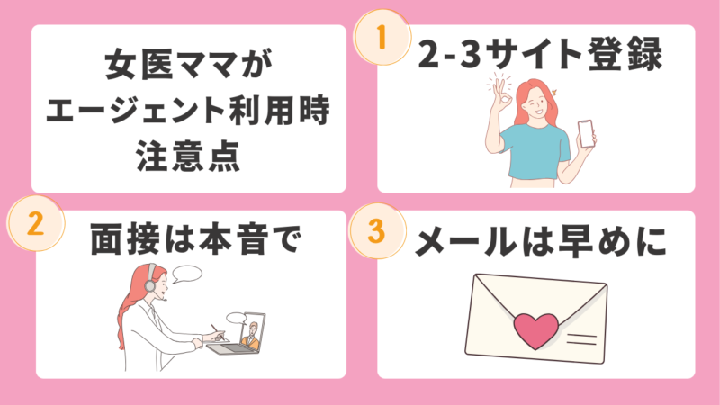 転職が初めての女医ママは、まず医師専門エージェントの中核である医師転職ドットコムをメインに活用しつつ、ほかのエージェントも併用して求人の幅を広げるのがおすすめです。