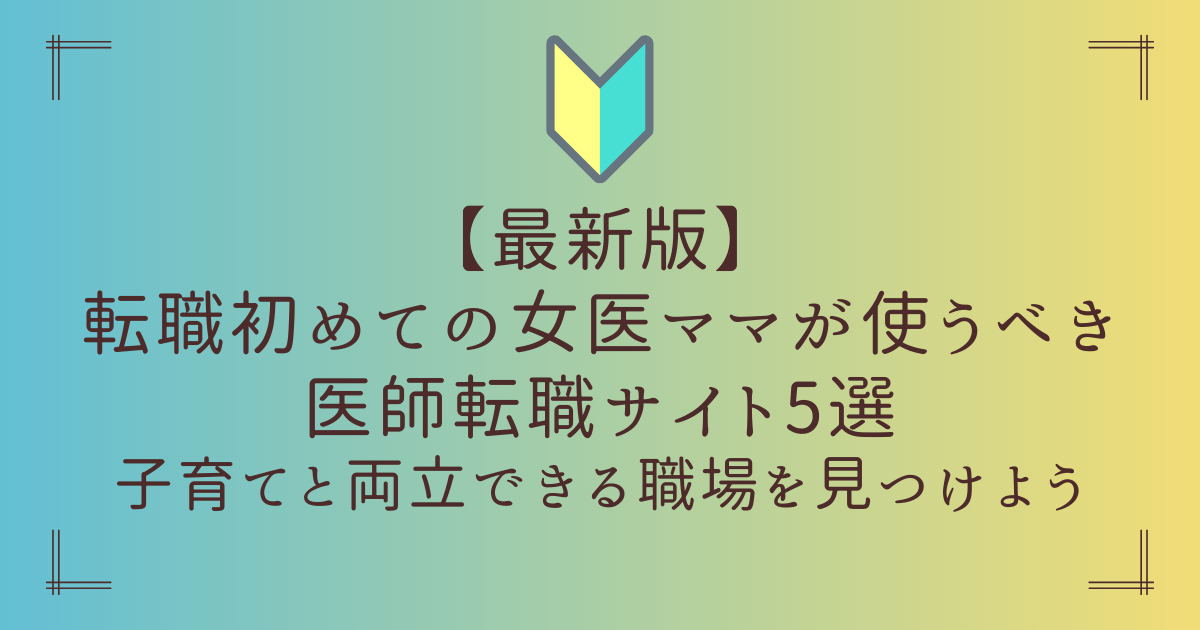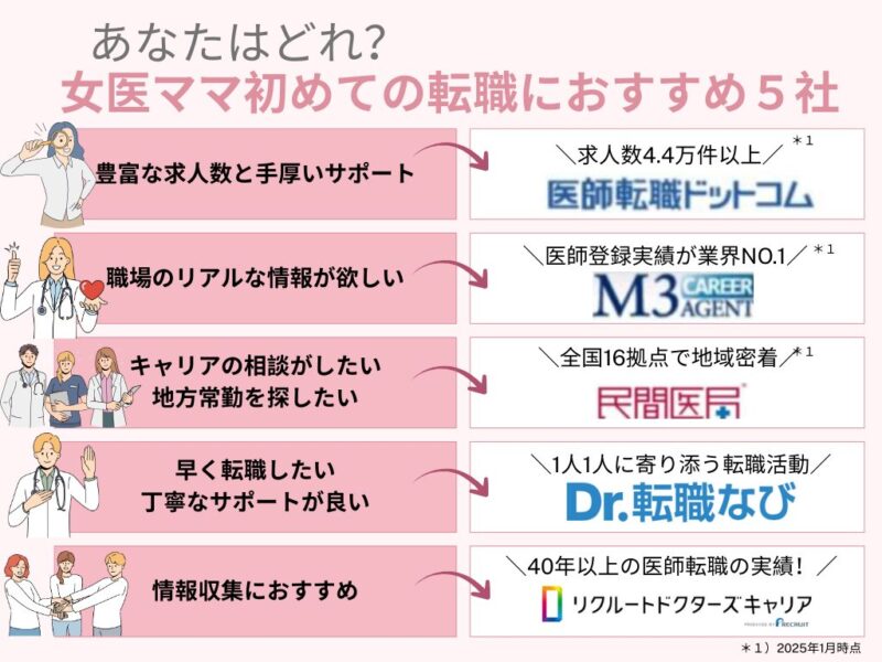そこでこの記事では、転職が初めての女医ママに本当におすすめできる転職エージェント5社を厳選してご紹介します。